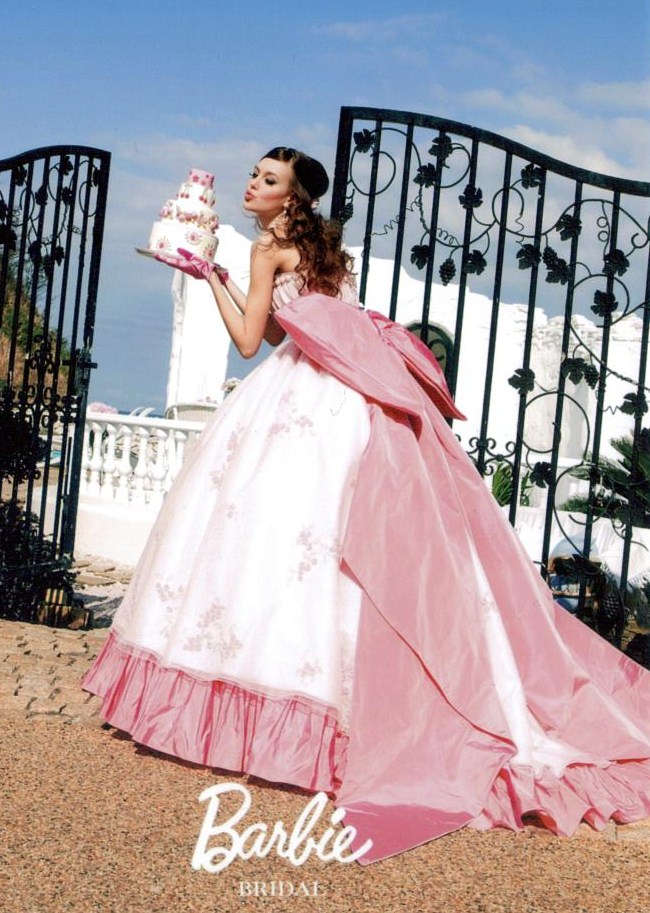ラメ入りのピンクに黒とヴィヴィッドピンクのドットが煌めくお色直しドレス。