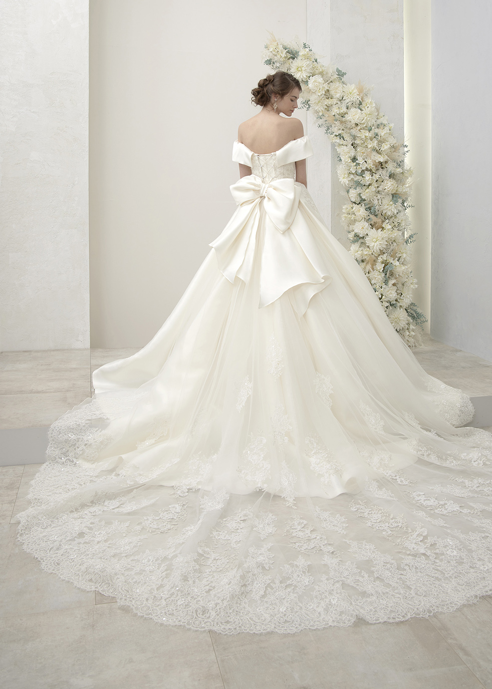 ミカドをたっぷりと使用した王道ビックプリンセスライン。リボン型のロールカラーが人気。2種類のレースをミックスしてクラシカルな中に可愛らしさをプラスしています。バックスタイルにはビックリボン+クルミ釦+ロングトレーンと花嫁様が大好きな要素をふんだんに取り入れた1着です。一目ぼれ花嫁続出のゴージャスなこのウェディングドレスを纏って光り輝く花嫁姿に・・・。