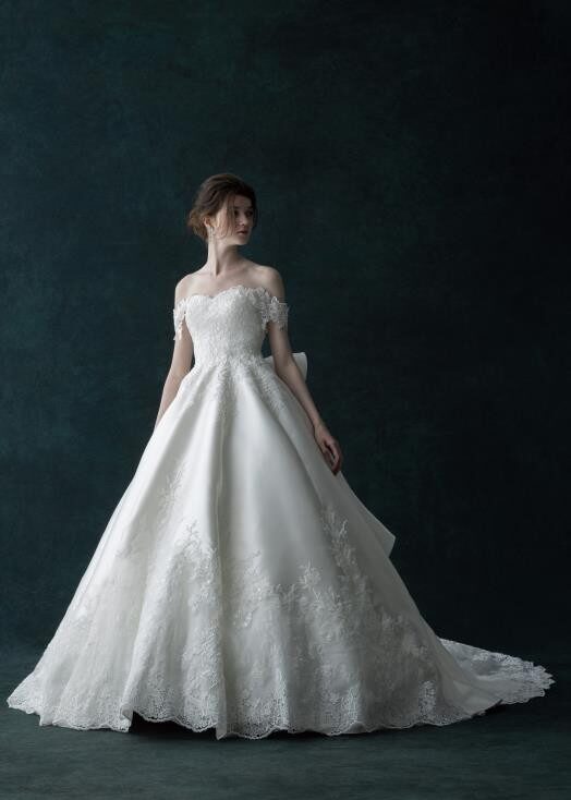ボリュ-ム感のあるプリンセスラインのスカ-ト。ケミカルレースとビーズレース、グリッターレースを惜しみない生地使いで華やかに仕上げています。人気のオフショルダーは取り外しも可能です。一目ぼれ花嫁続出のゴージャスなこのウェディングドレスを纏って光り輝く花嫁姿に・・・。